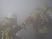 Erste Erfahrungen konnten die angehenden Einsatzkräfte am ersten Termin, dem 17. Juni, sammeln, an dem mehrere Personen, die durch Übungspuppen dargestellt wurden, versteckt und ein Brandherd im ersten Obergeschoss bei dichtem Kunstnebel simuliert wurden. Nach Eintreffen der Feuerwehr gegen 19:30 Uhr mit vier Einsatzfahrzeugen und erster Erkundung der Situation durch den Zugführer wurde zunächst die Personenrettung durchgeführt. Mit schwerer Ausrüstung unter Atemschutz und dem unter Druck gesetzten Feuerwehrschlauch mussten die Einsatzkräfte die vermeintlich verletzten Personen ausfindig machen und sicher retten. Dank der modernen Ausstattung unter anderem mit Wärmebildkameras war dies trotz schlechter Sicht im dunklen Gebäude innerhalb weniger Minuten möglich. Nach der Personenrettung und Sicherung des Gebäudes wurde der simulierte Brandherd gefunden und das Feuer musste gelöscht werden.